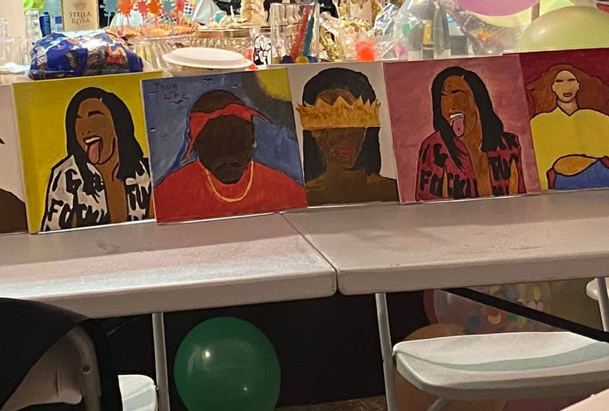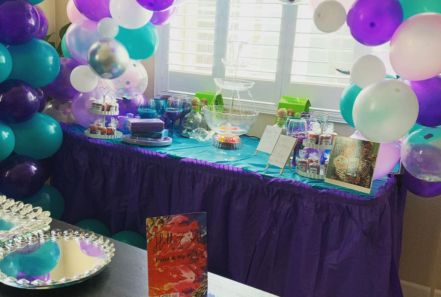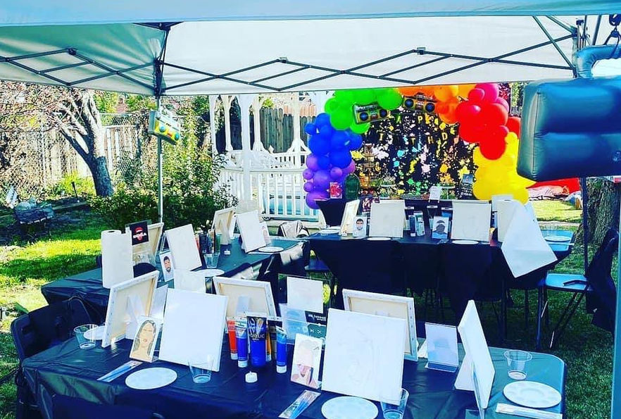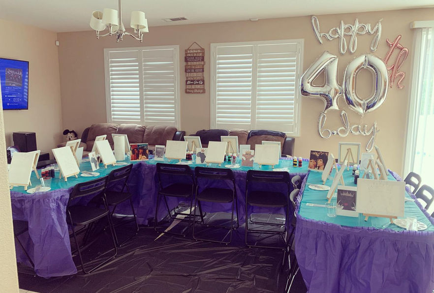 Canvas, bushes, paint, palettes, aprons, custom apron for host, 3 centerpieces, wine glasses or simple party favor for each guess is included, and 4 table covers. Pick up to images